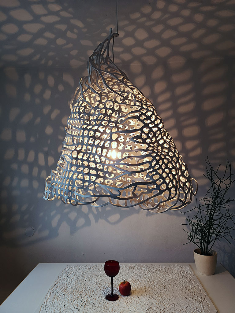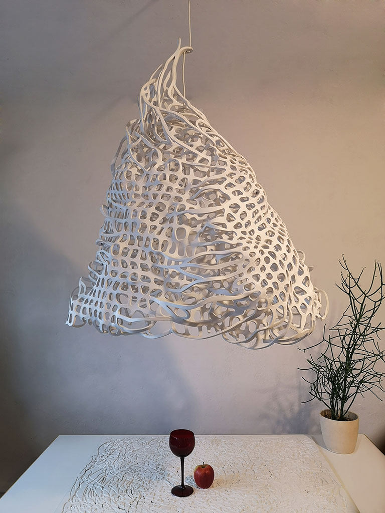 Ażurowe warstwy tworzące kształt lampy przenikają się wzajemnie, tworząc organiczną, przestrzenną strukturę.